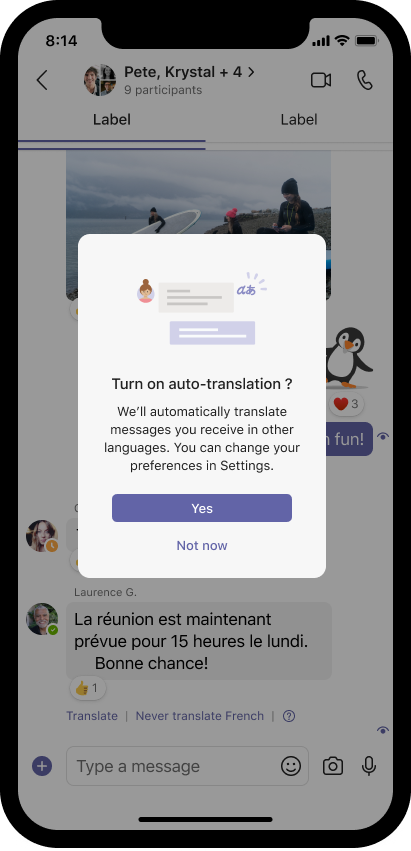 Teams will also prompt you to turn on auto-translation to automatically translate messages to your preferred language. You can always change your preferences by selecting your profile picture, then choosing Settings