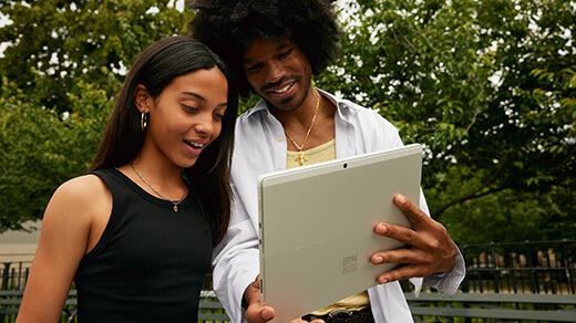 Two young women dressed in trendy fashion excitedly look at their Windows 11 device while sitting at an outside cafe table.