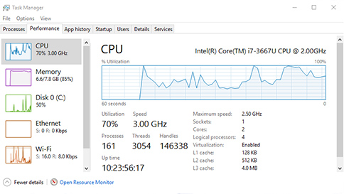 2. When the Task Manager window opens, select the Performance tab on the left side of the window, and then make sure CPU is selected.